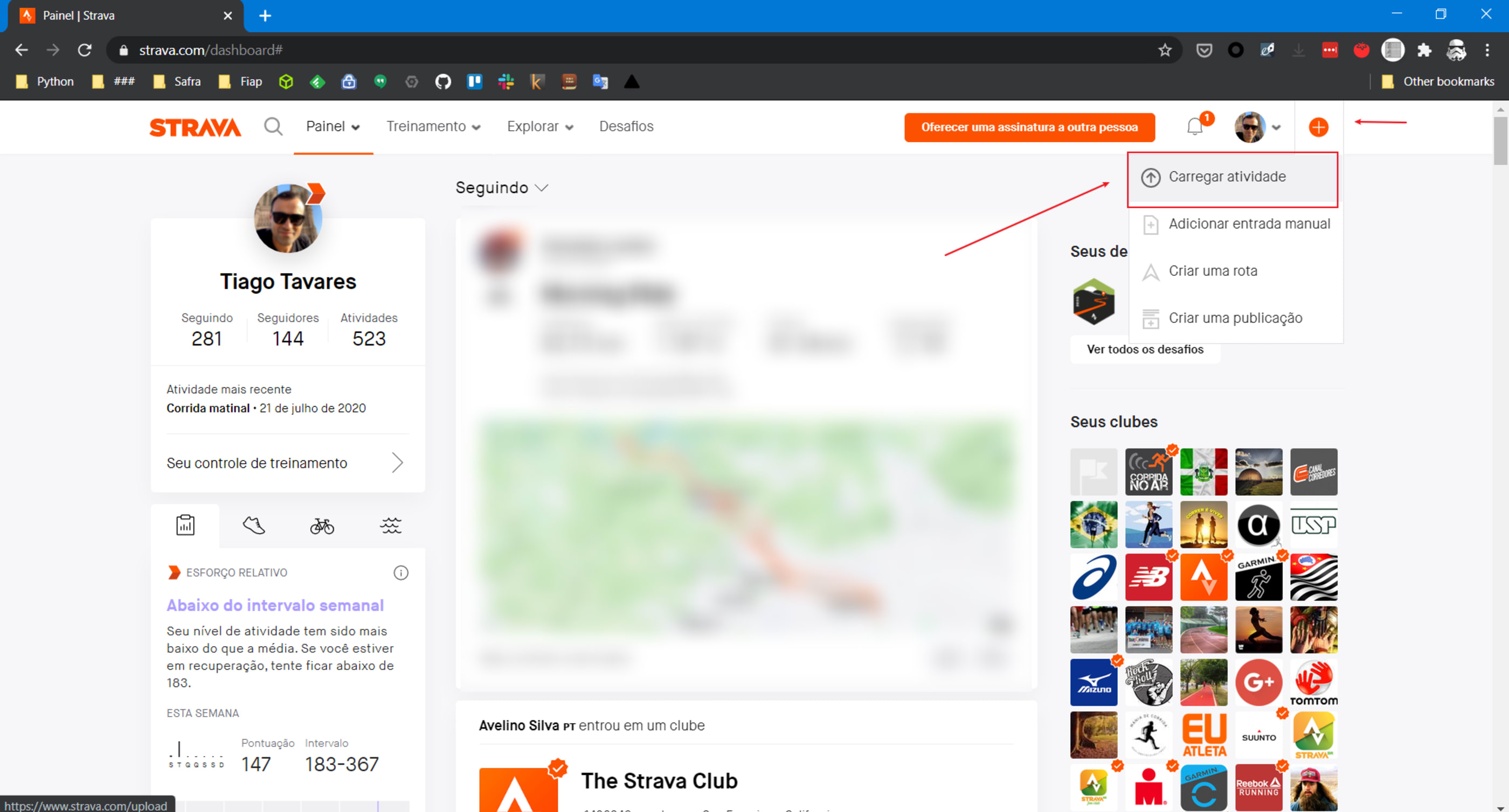 Acesse sua conta no Strava, clique no sinal de + e depois em Carregar atividade.