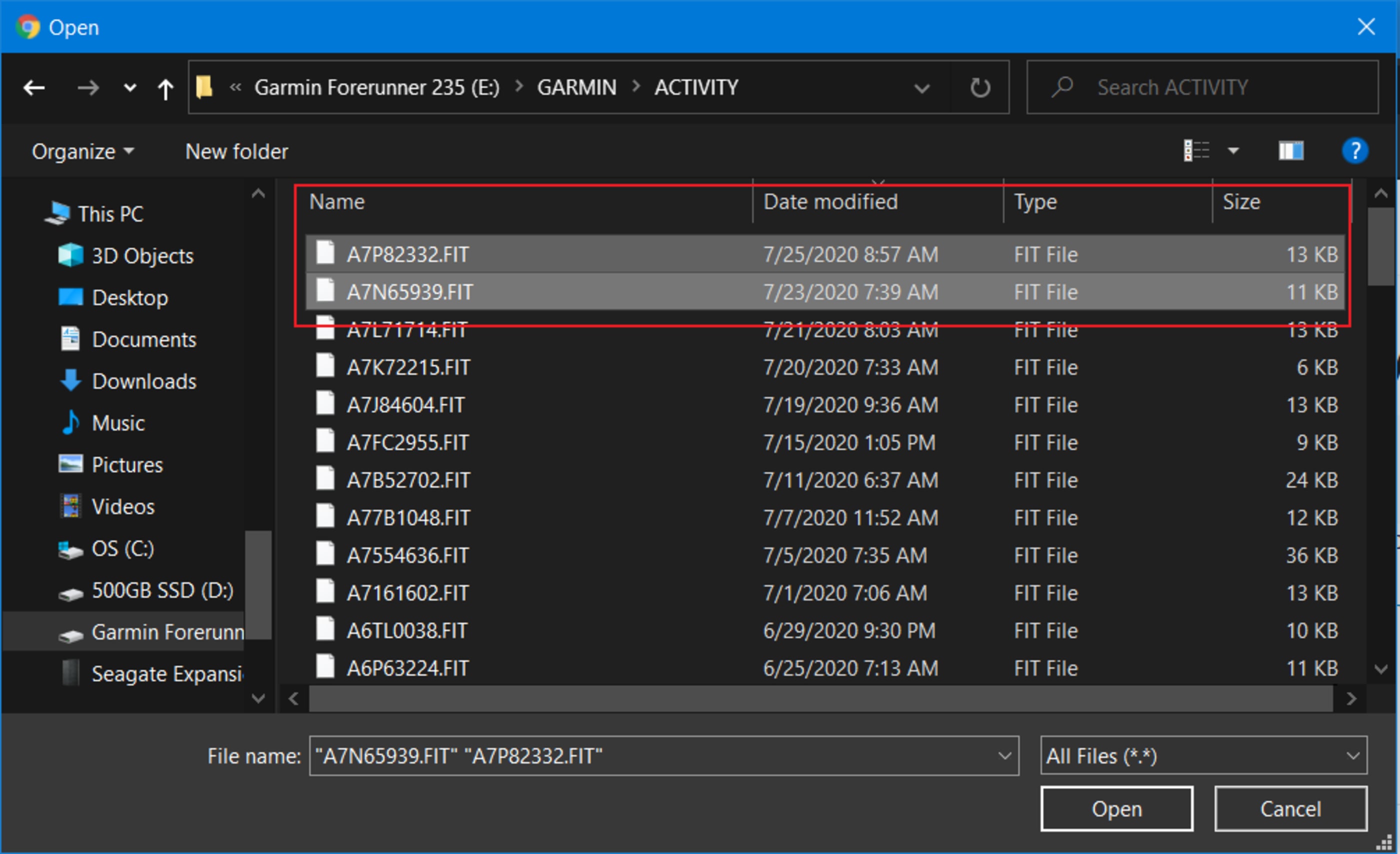 Seus treinos estarão gravados na pasta ACTIVITY. Todos os arquivos possuem a extensão .FIT.