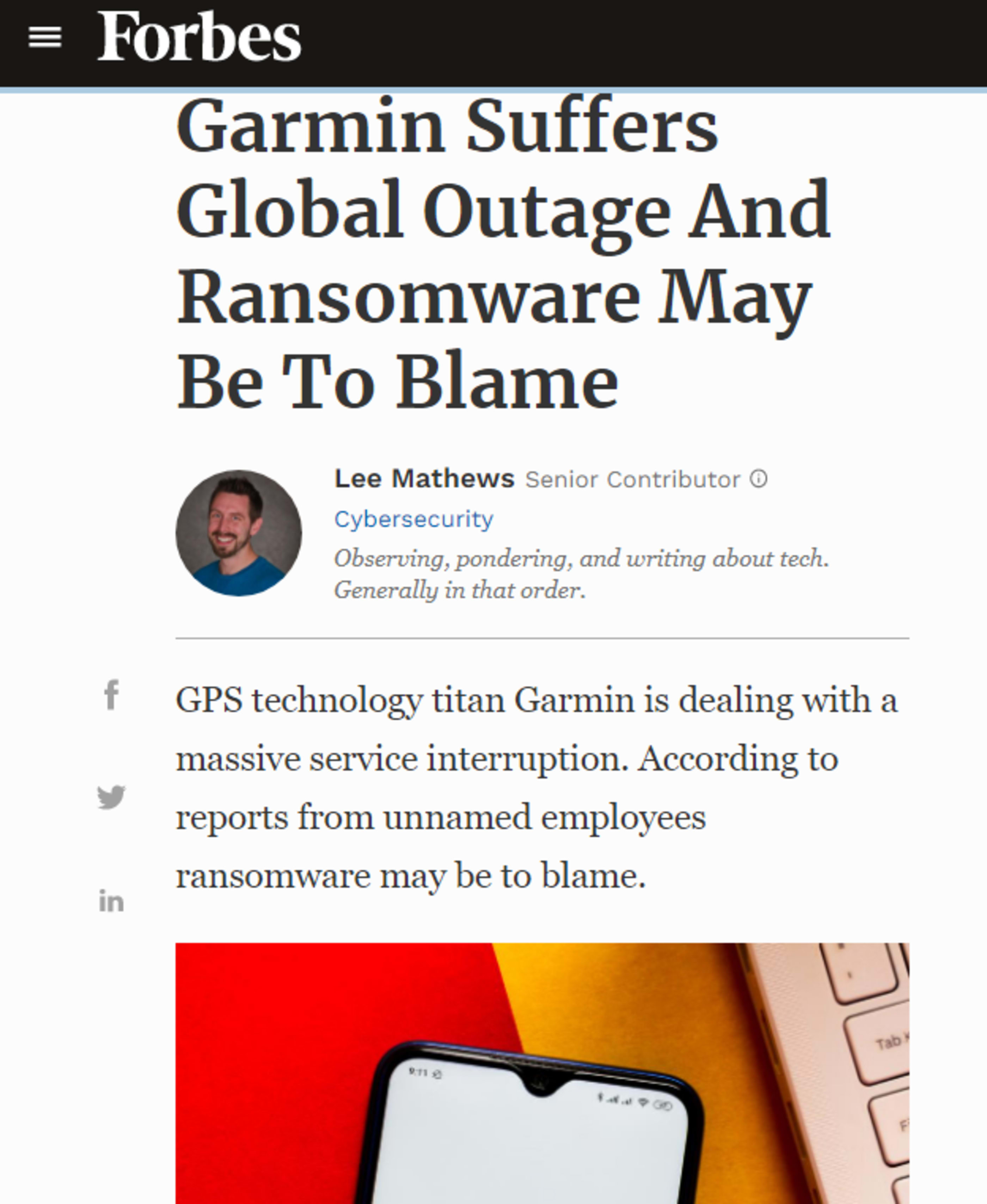Segundo a TechCrunch em um texto atualizado neste sábado dia 25/07/2020, o comprometimento dos serviços da Garmin foram causados devido a um ataque de ransomware, de acordo com fontes distintas consultadas.