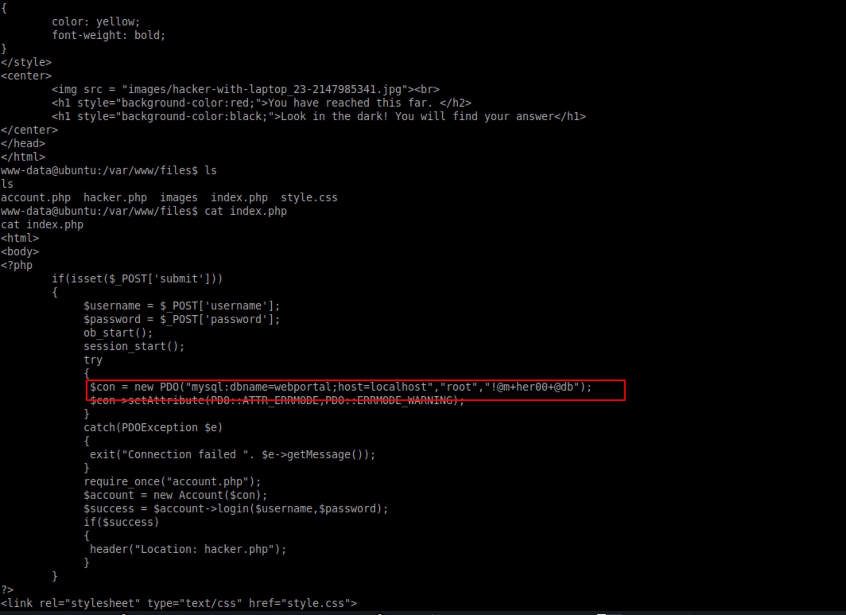 So far, I couldn’t use any of MySQL information, so I’ll keep looking further in the hacker.php π. There is something suspect there…π§