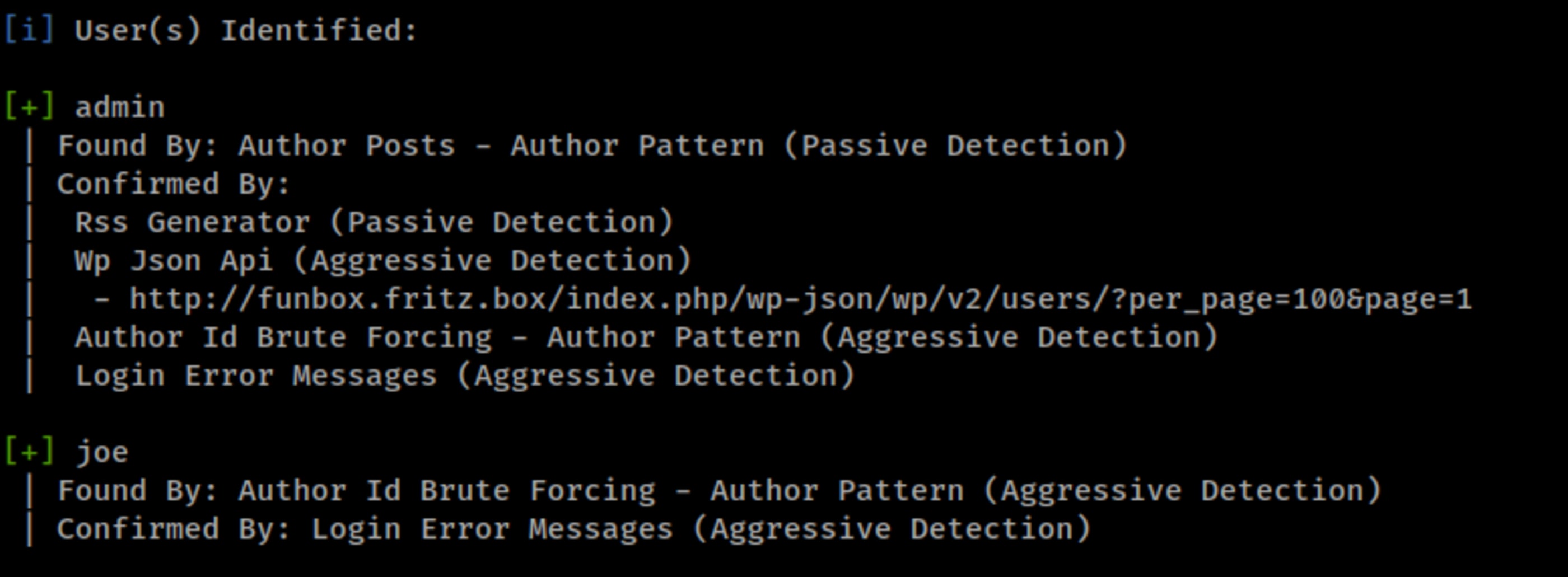 Unfortunately it couldn’t find any vulnerable plugin or something, but the users allowed to login, admin and joe.
