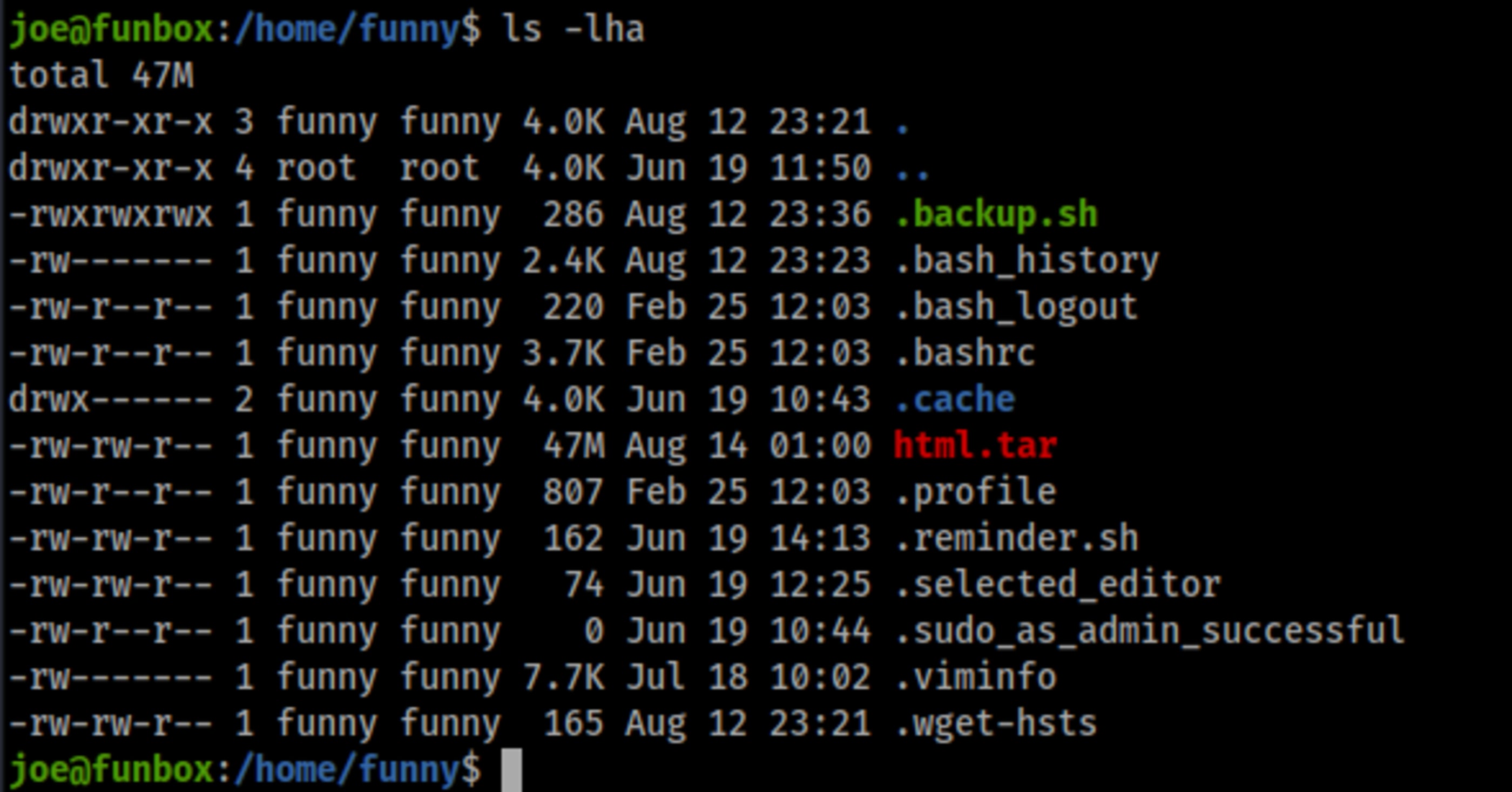 -rw-rw-r-- 1 funny funny 48701440 Aug 12 00:38 html.tar