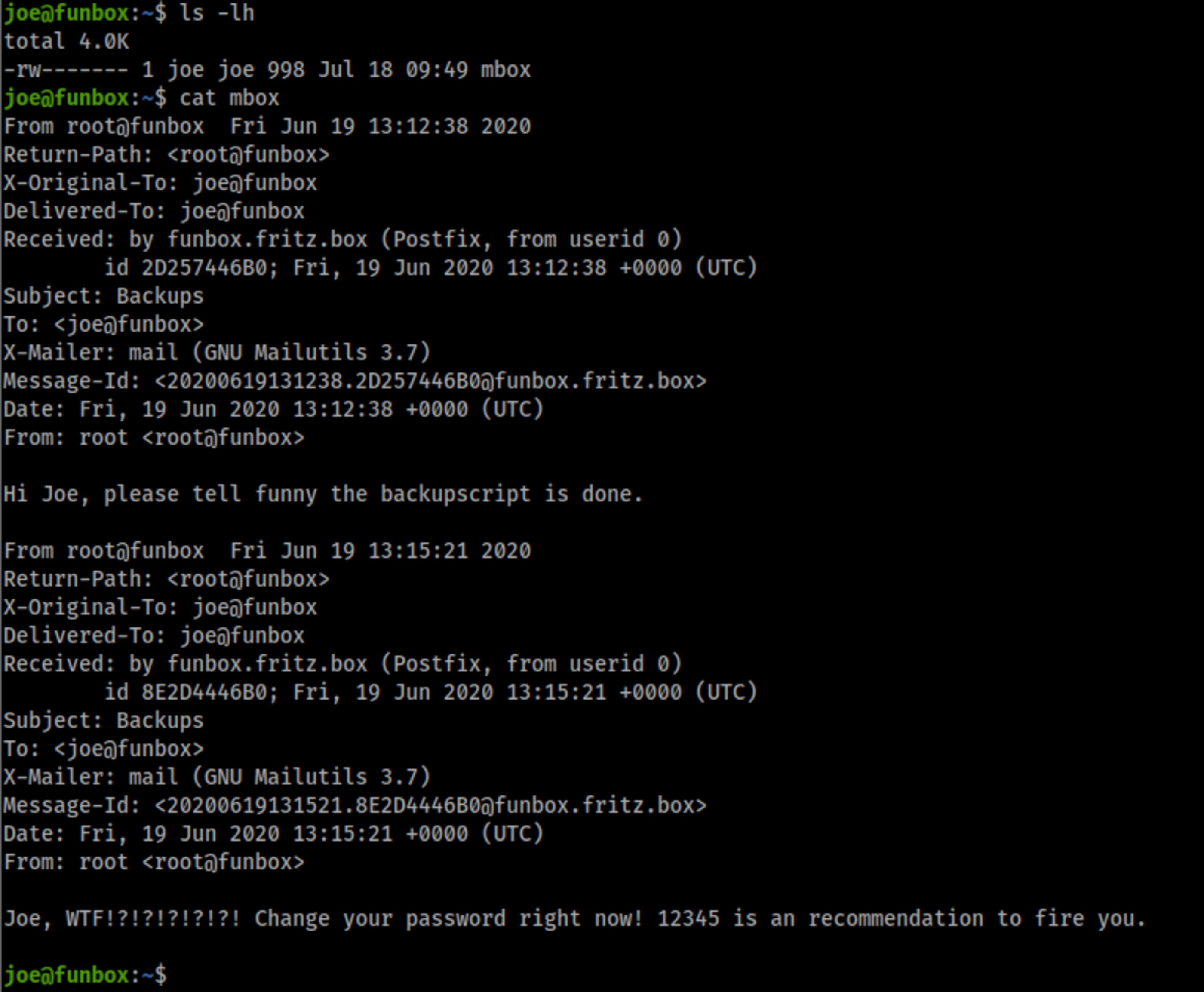 -rw------- 1 joe joe 998 Jul 18 09:49 mbox