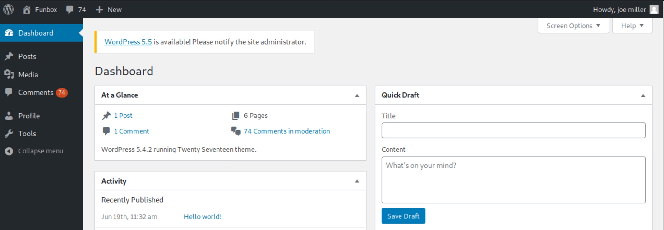 | 1 | admin | $P$BGUPID16QexYI9XRblG9k8rnr0TMJN1 | admin | funny@funbox.box | | 2020-06-19 11:32:16 | | 0 | admin |