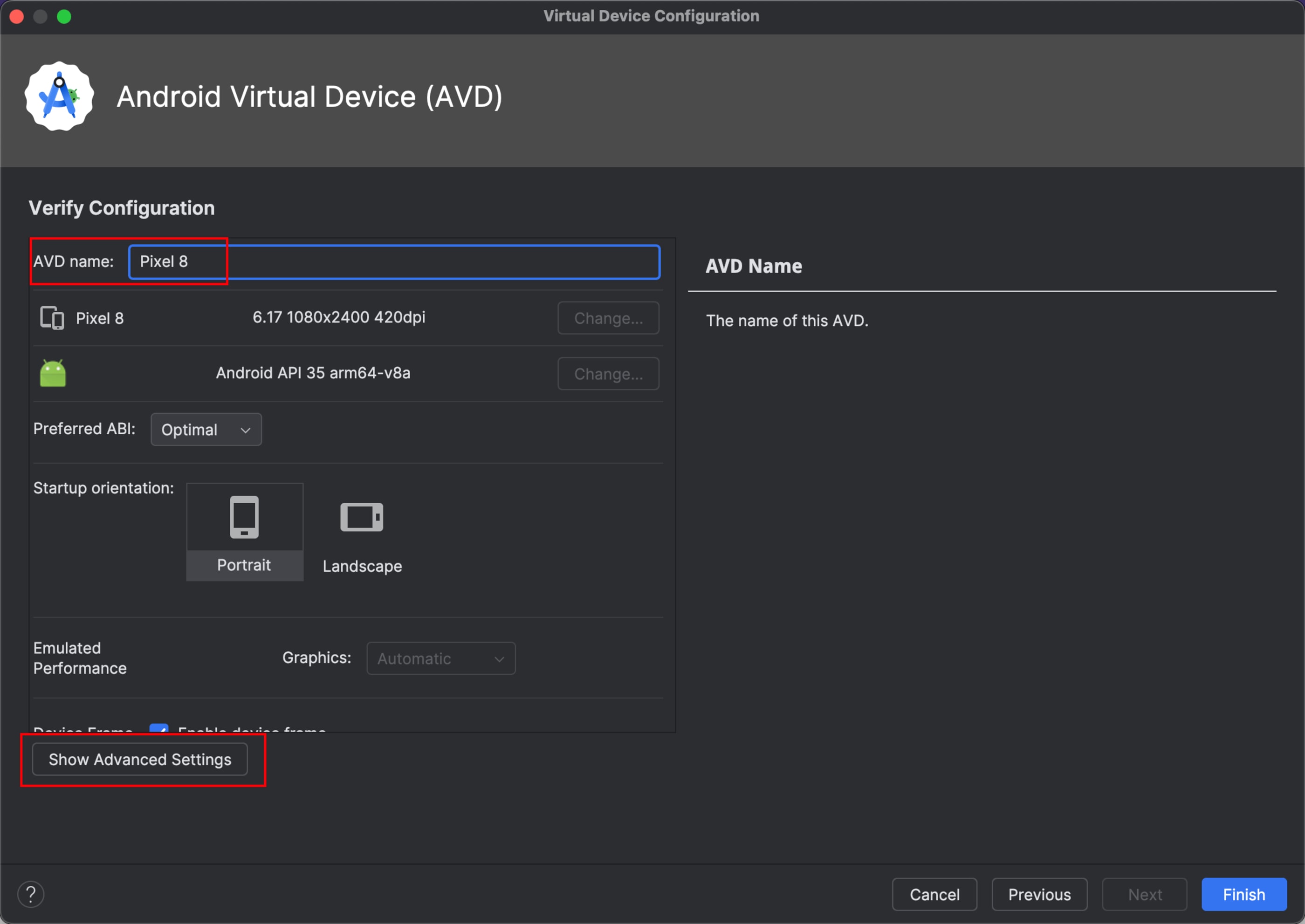 Pressione “Next” novamente e nomeie o seu Android Virtual Device (AVD).