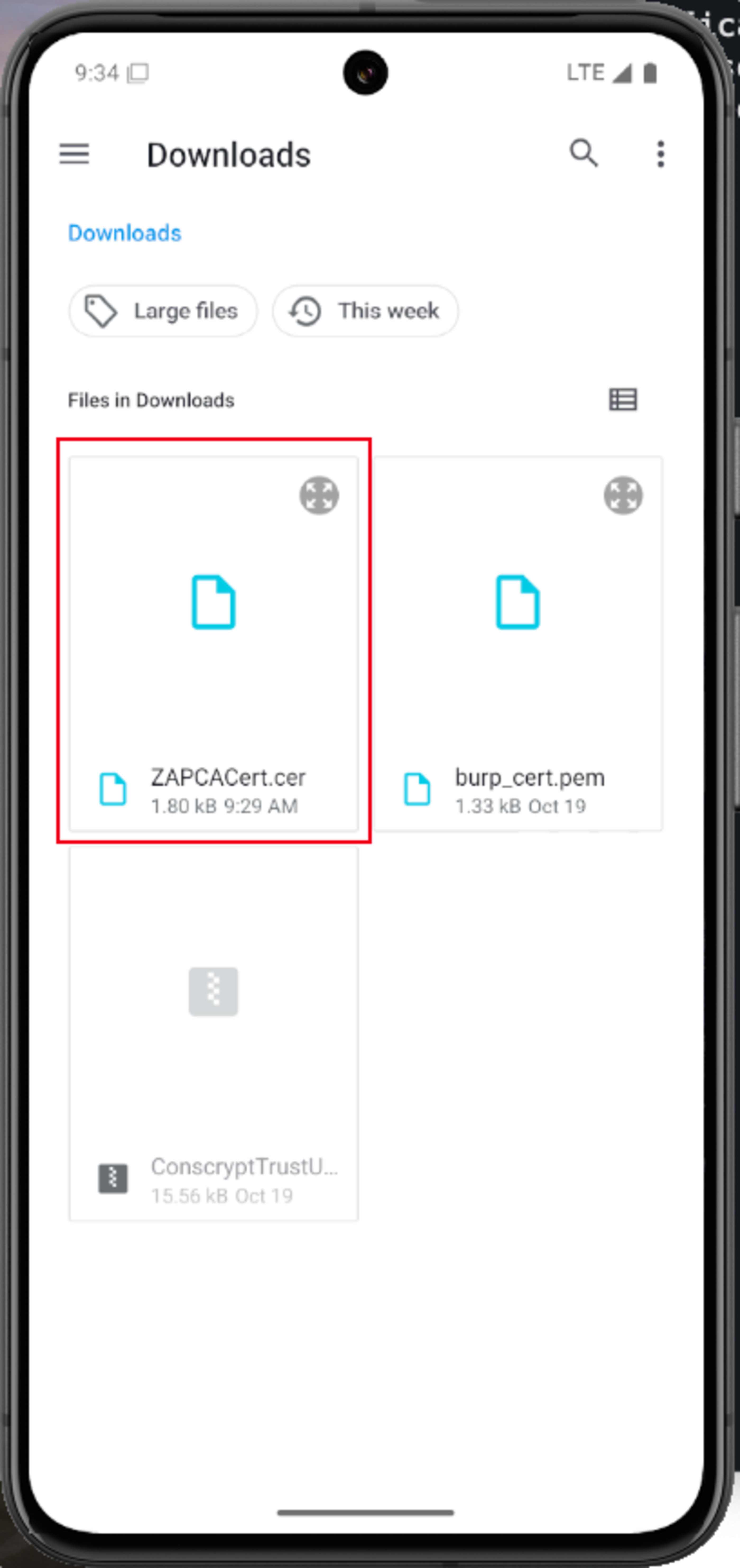 Agora, instale o certificado em Settings-> Security & privacy -> More security & privacy -> Encryption & credentials -> Install a certificate -> CA Certificate, selecione a pasta de Downloads e selecione o certificado do ZAProxy e instale.