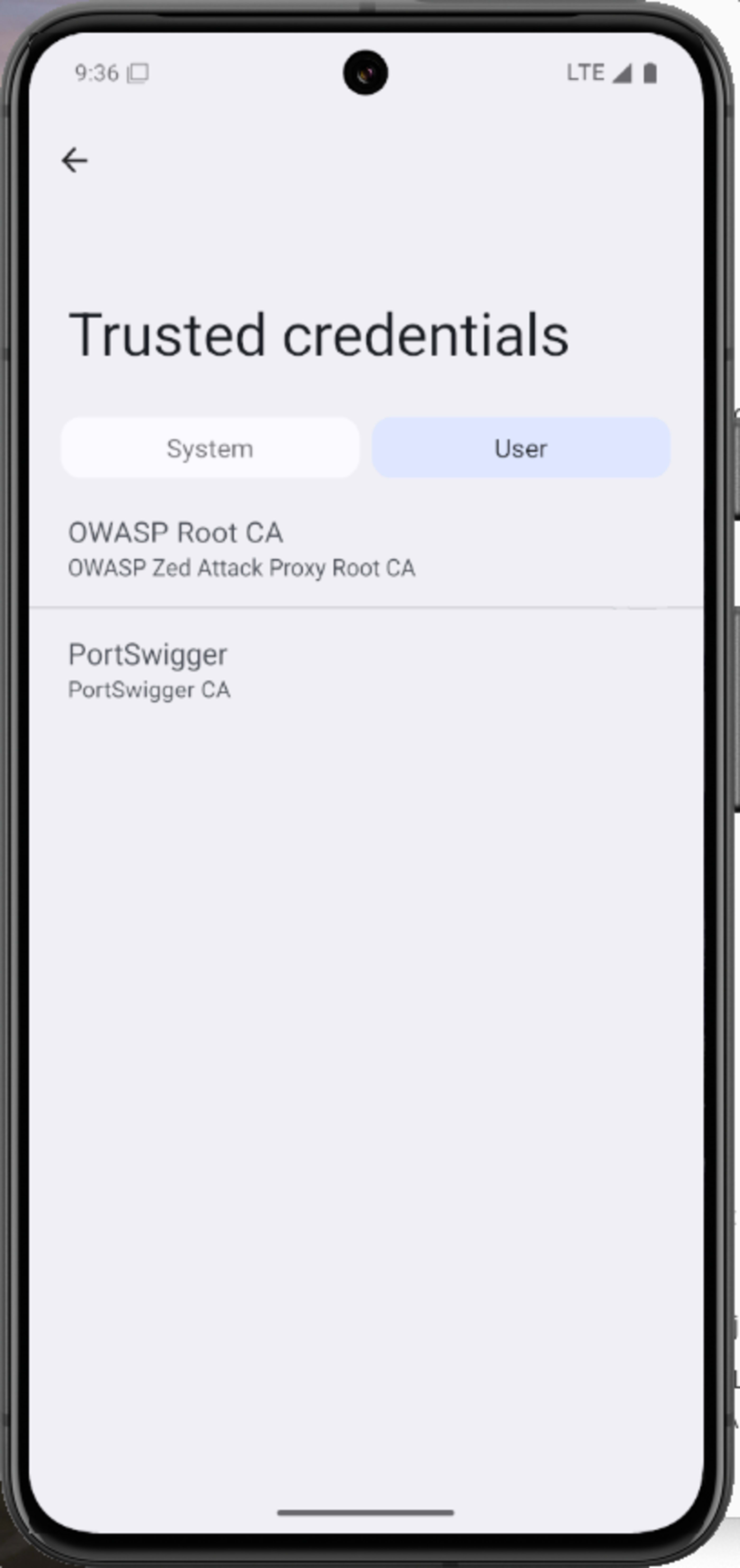 Reinicie o Android, volte para Configurações e encontre a seção Trusted Credentials. Agora você pode ver o certificado Burp CA do Portswigger nos armazenamentos do Usuário e do Sistema.