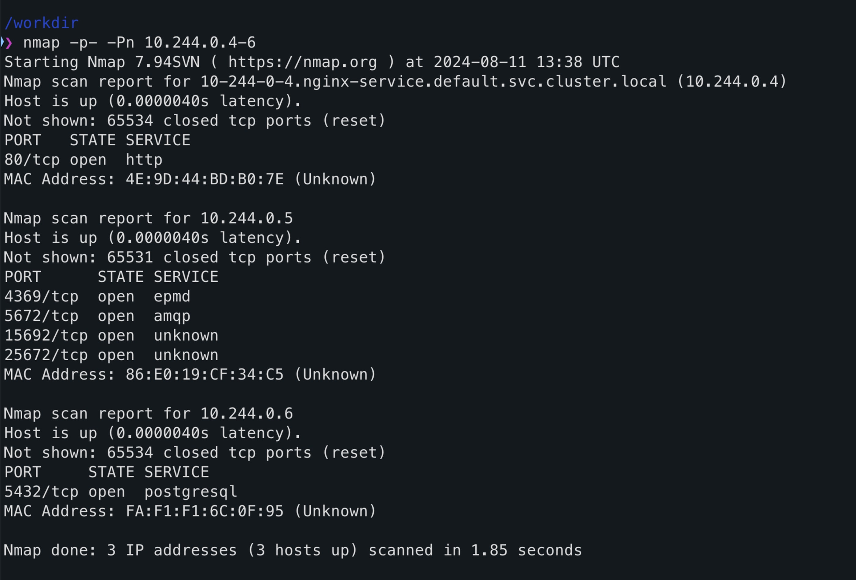 nmap -p- -Pn 10.244.0.4-6