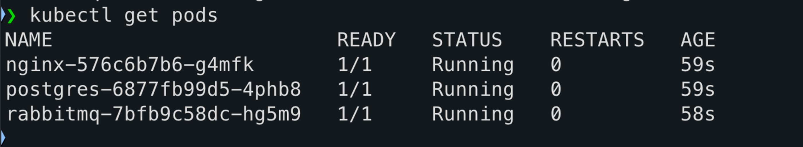 nos pods do Nginx, Postgres e RabbitMQ.