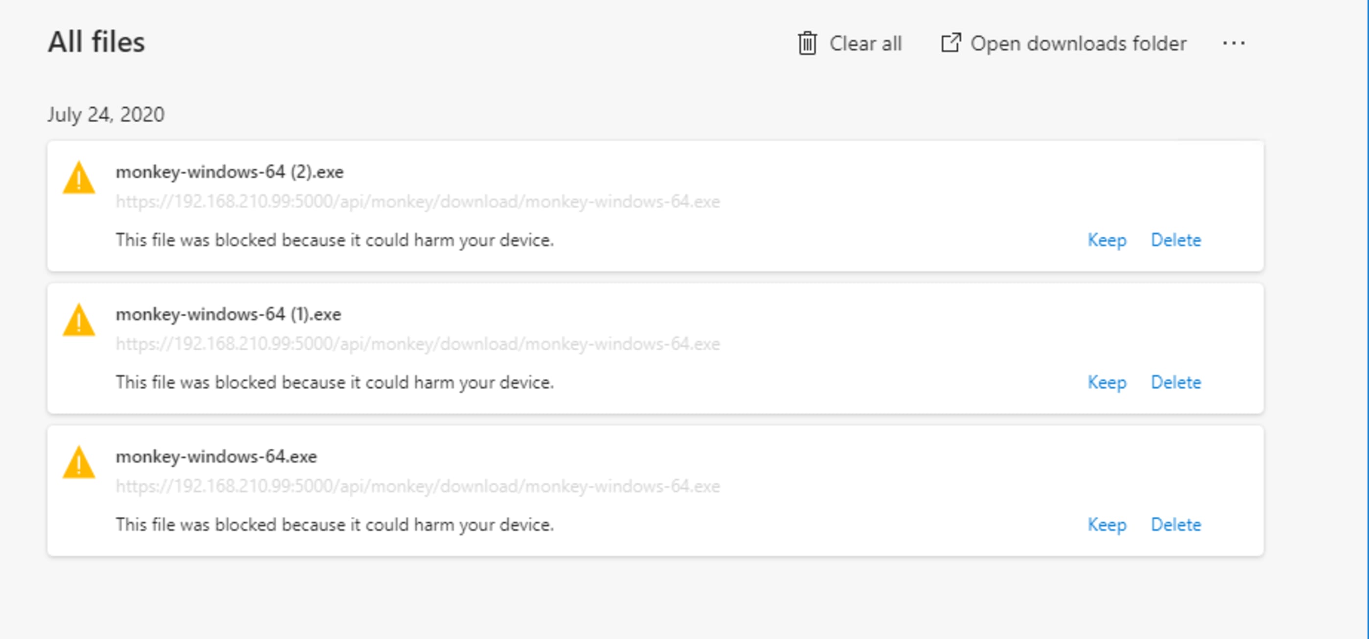 Você poderá executar o comando gerando em PowerShell no Windows, ou simplesmente baixar o cliente pela URL identificada no comando, https://192.168.210.99:5000/api/monkey/download/monkey-windows-64.exe