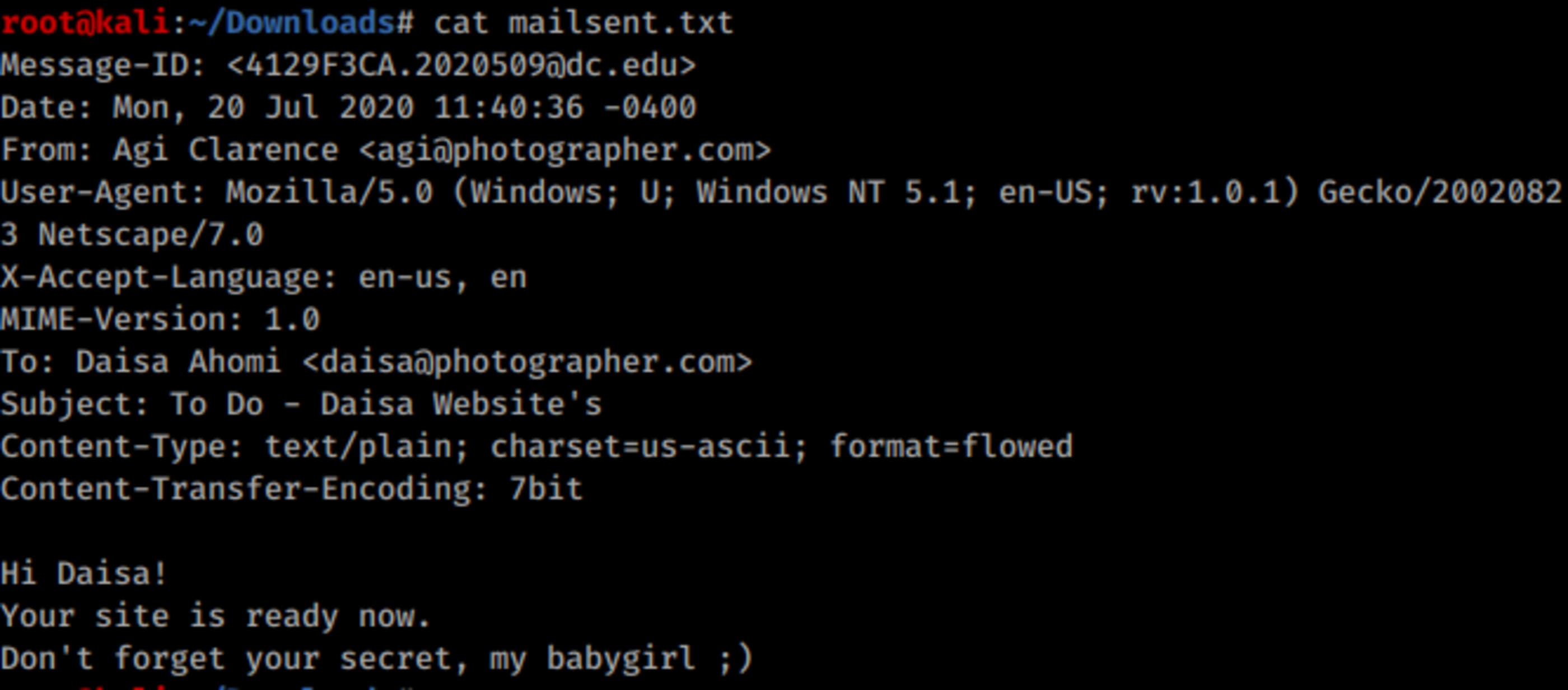 Now we have the two emails regarding to the users we found at passwd file, agi@photographer.com and daisa@photographer.com.