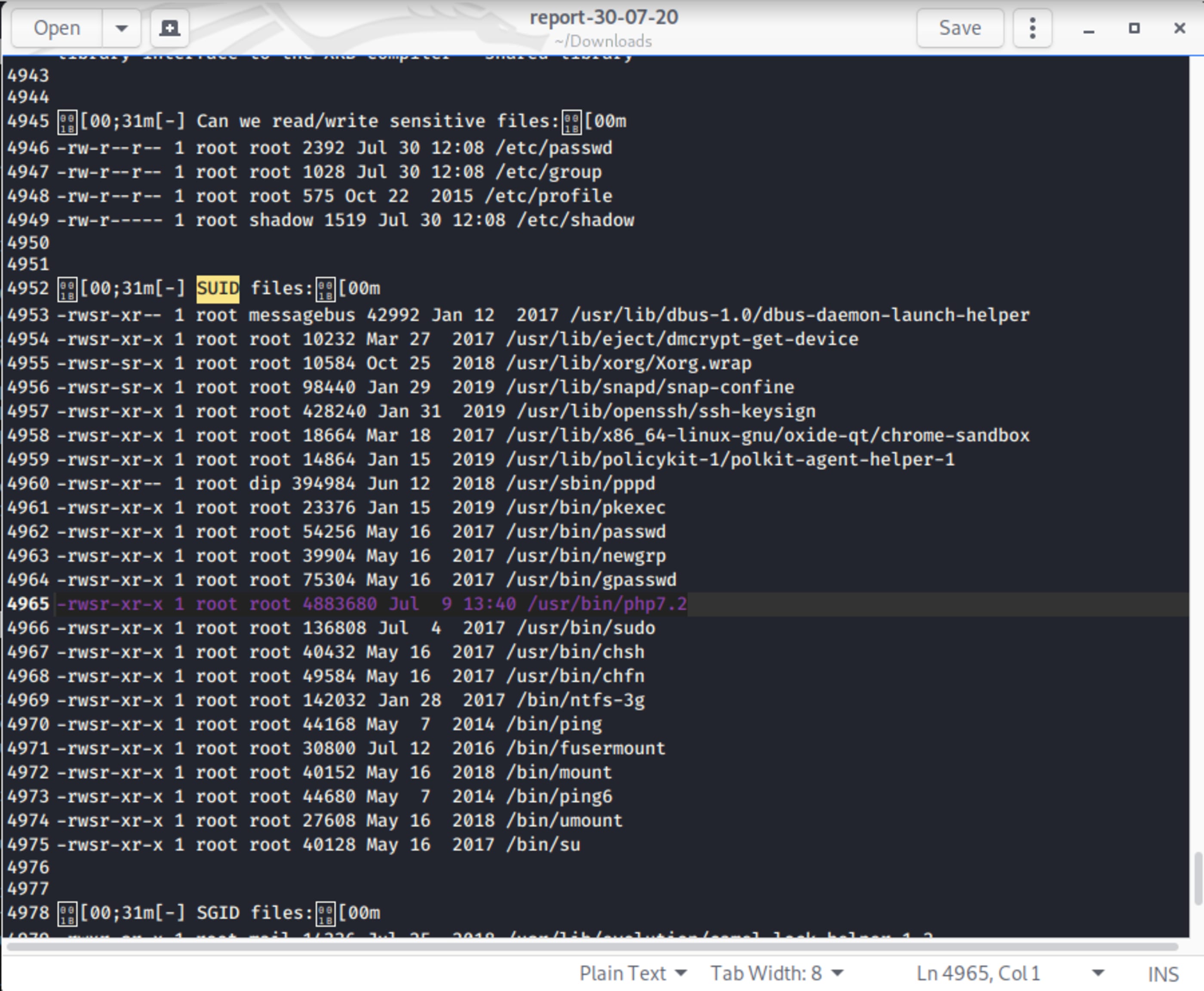 Taking a look at the binaries with SUID bit active, we found /usr/bin/php7.2